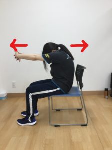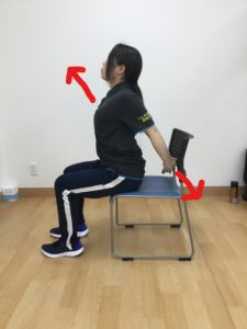 ④手のひらは胸に向け、背中と手でひっぱりあうように前後に伸びる!